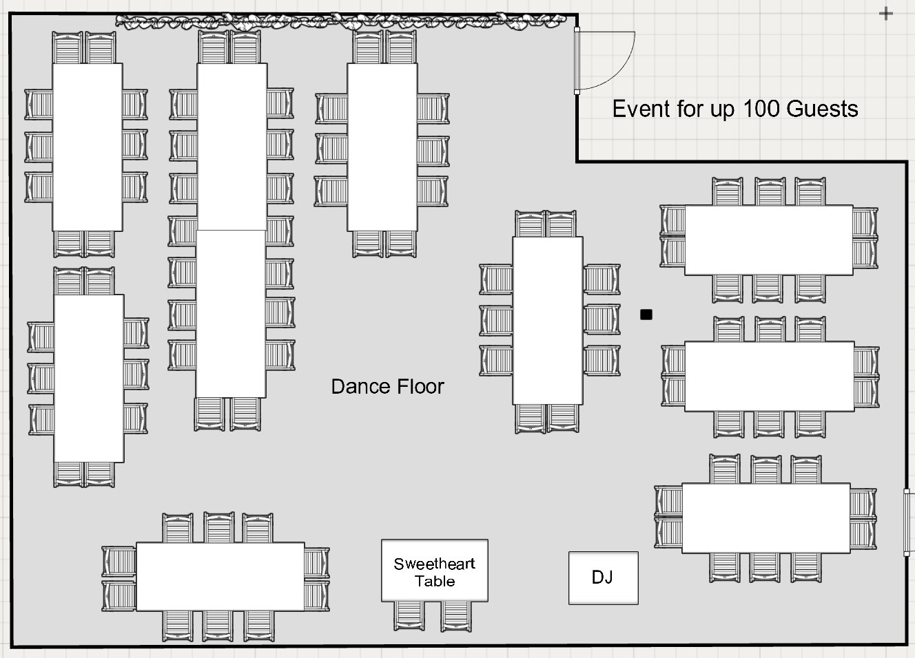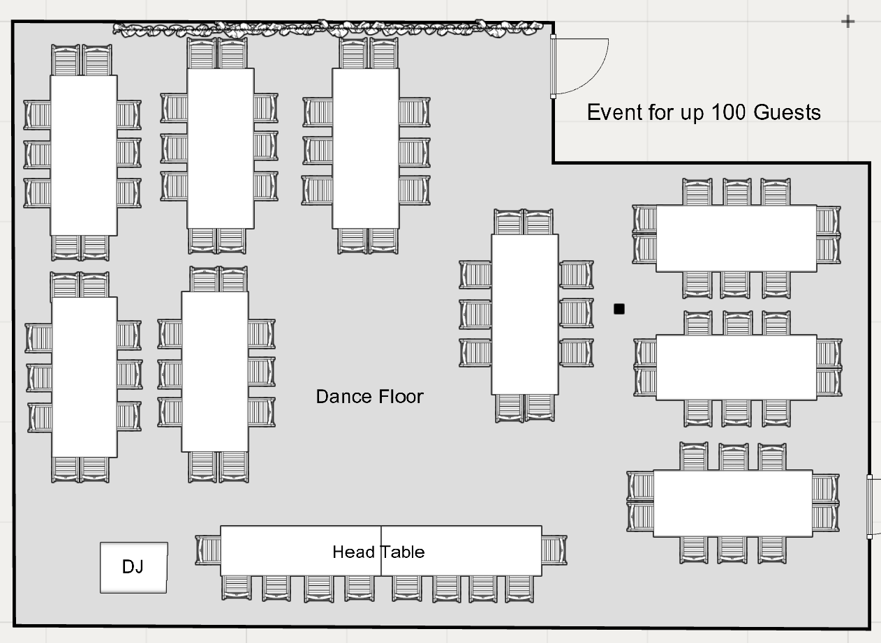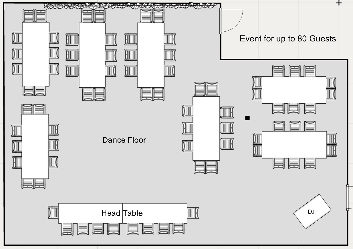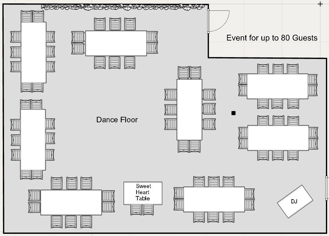 Floor Plans View fullsize Events for up to 80 guests (w/Head Table) View fullsize Events for up to 80 guests (w/Sweetheart Table) View fullsize Events for up to 100 guests (w/Head Table) View fullsize Events for up to 100 guests (w/Sweetheart Table)